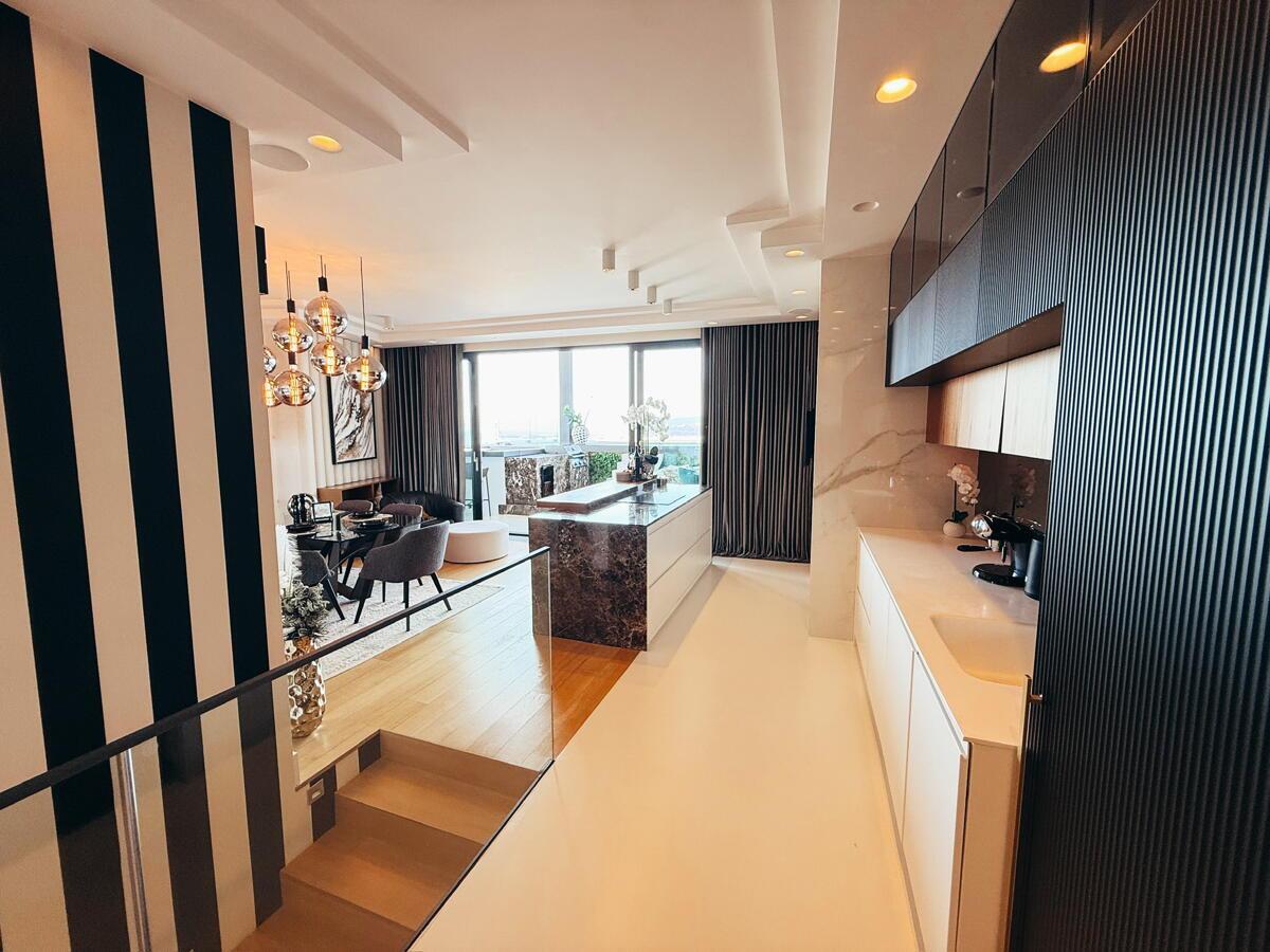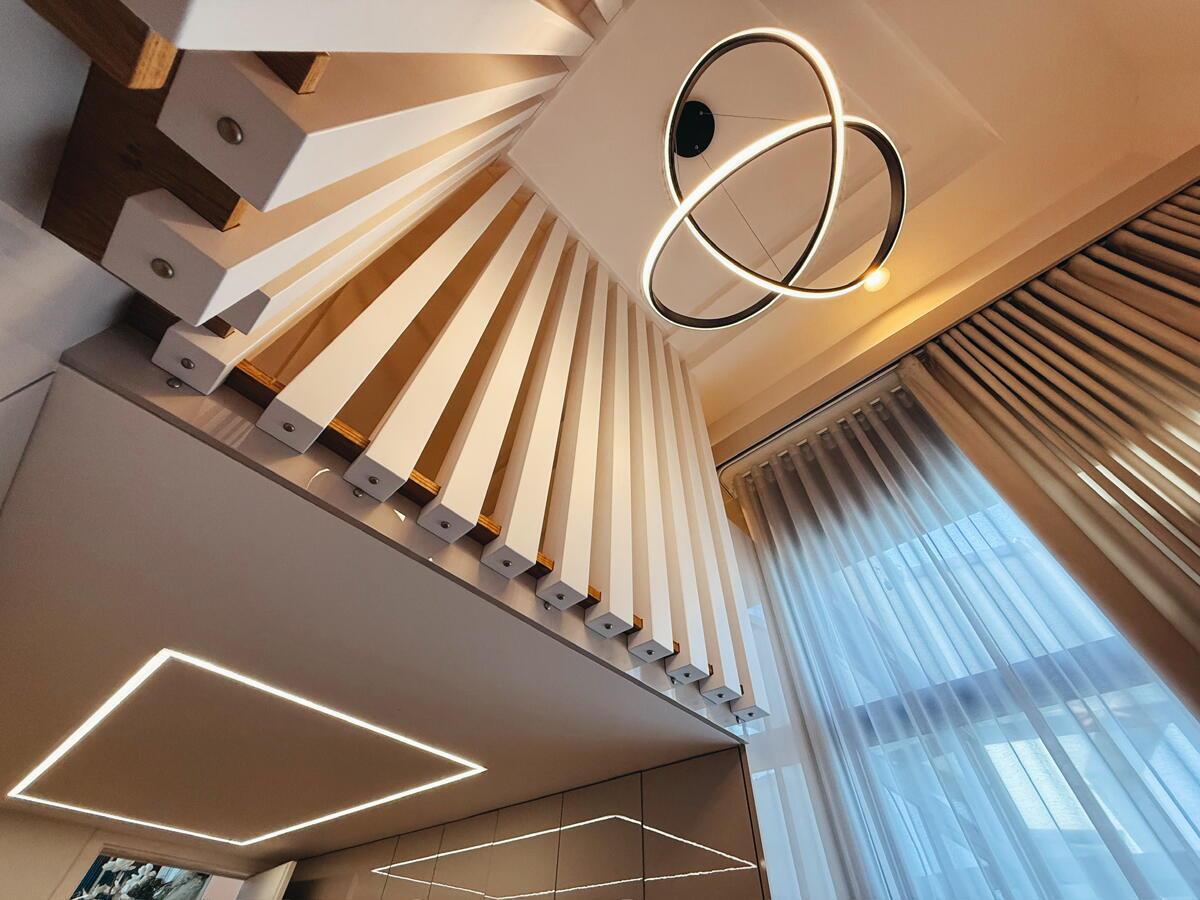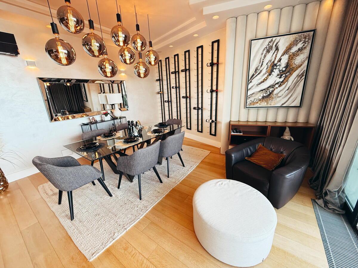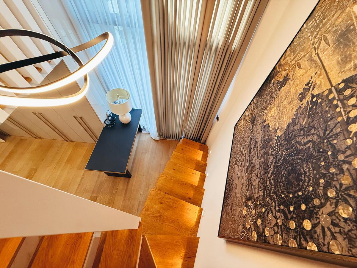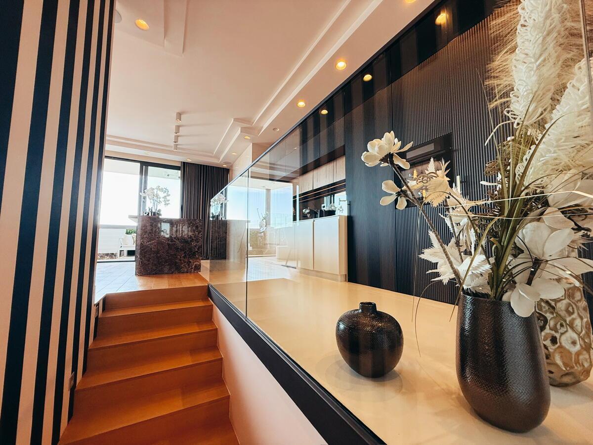Stanovanje zajema predprostor in dolgi hodnik iz katerega se dostopa do vseh prostorov. V prvem prostoru se je uredila dnevna soba z veliko sedežno garnituro modernimi elementi ter veliko televizijo. Stropovi 4,80 m so omogočili, da se je spalnica uredila v dveh etažah in sicer tako, da so v spodnji omare v zgornji pa intimni prostor za posteljo 180 x 200 cm ter nočni omarici in TV. Manjša splanica, ki je mišljena kot otroška soba ali kabinet ima prav tako dvignjeno posteljo na višjo etaža. Omenjeni kvadrati etaž niso všteti v 133.11 m2, kar ima stanovanje bivalne površine po evidencah Gurs. Hodnik se konča s stopnicami v veliko kuhinjo z jedilnim delom in dnevnim kotičkom. Ta prostor ima drsna, panoramska okna ter izhod na teraso s pogledom na morje. Prav ta terasa je najlepši element stanovanj, saj ima nadstrešek in kot takšna predstavlja podalšek stanovanja ter mu daje pridih indoor outdoor bivanja vse mesece v letu.