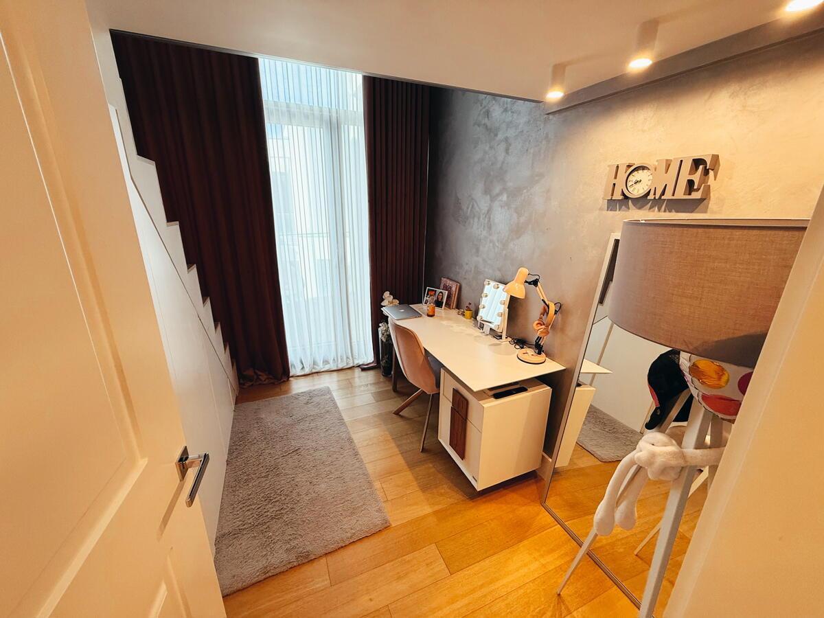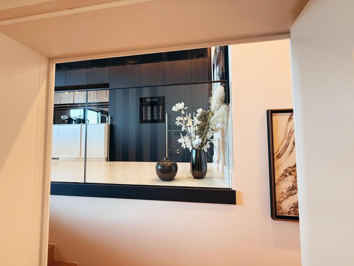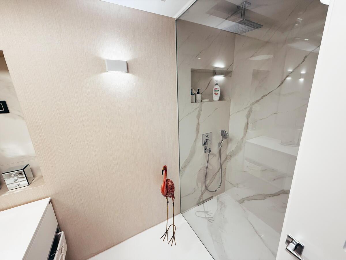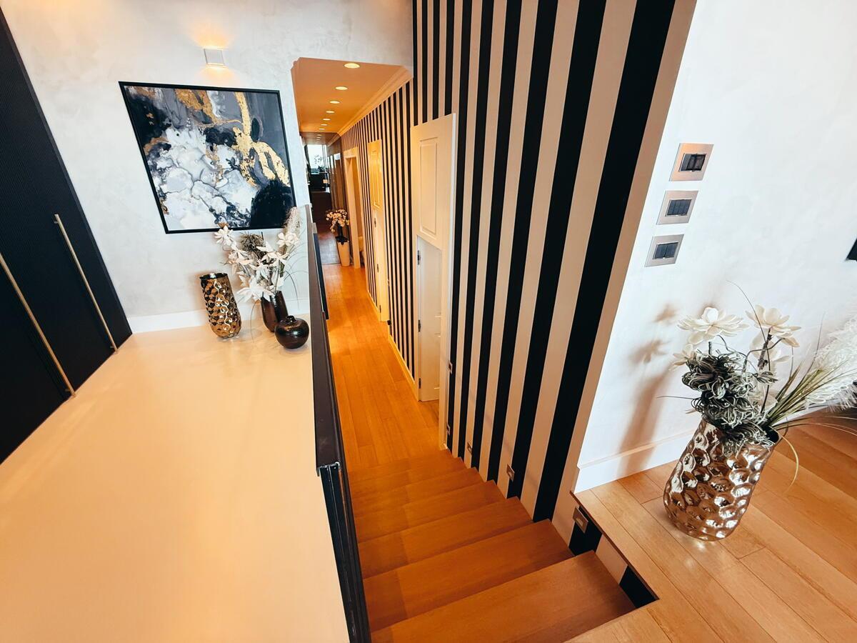 Stanovanje zajema predprostor in dolgi hodnik iz katerega se dostopa do vseh prostorov. V prvem prostoru se je uredila dnevna soba z veliko sedežno garnituro modernimi elementi ter veliko televizijo. Stropovi 4,80 m so omogočili, da se je spalnica uredila v dveh etažah in sicer tako, da so v spodnji omare v zgornji pa intimni prostor za posteljo 180 x 200 cm ter nočni omarici in TV. Manjša splanica, ki je mišljena kot otroška soba ali kabinet ima prav tako dvignjeno posteljo na višjo etaža. Omenjeni kvadrati etaž niso všteti v 133.11 m2, kar ima stanovanje bivalne površine po evidencah Gurs. Hodnik se konča s stopnicami v veliko kuhinjo z jedilnim delom in dnevnim kotičkom. Ta prostor ima drsna, panoramska okna ter izhod na teraso s pogledom na morje. Prav ta terasa je najlepši element stanovanj, saj ima nadstrešek in kot takšna predstavlja podalšek stanovanja ter mu daje pridih indoor outdoor bivanja vse mesece v letu.