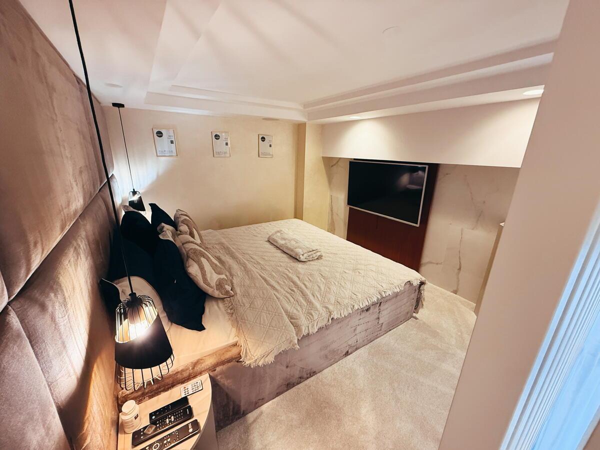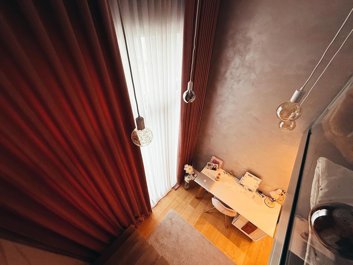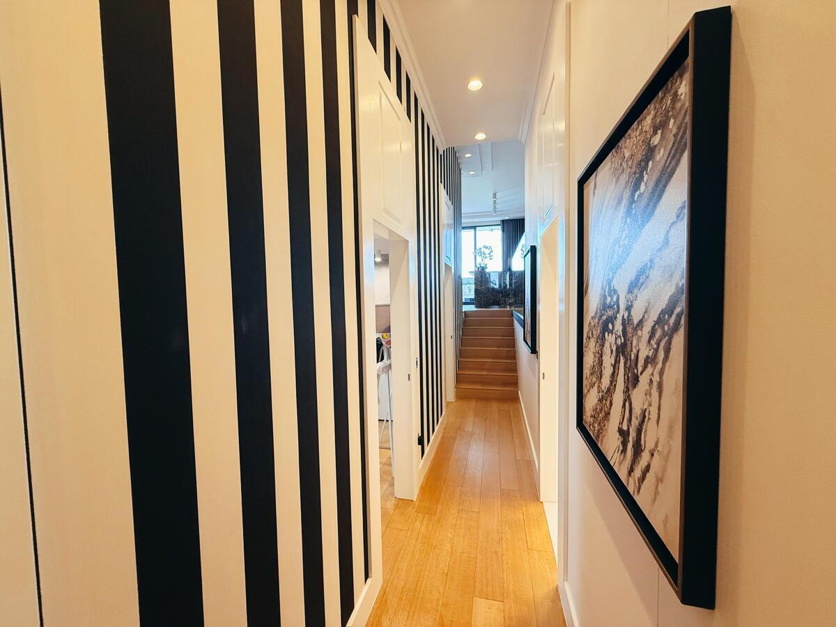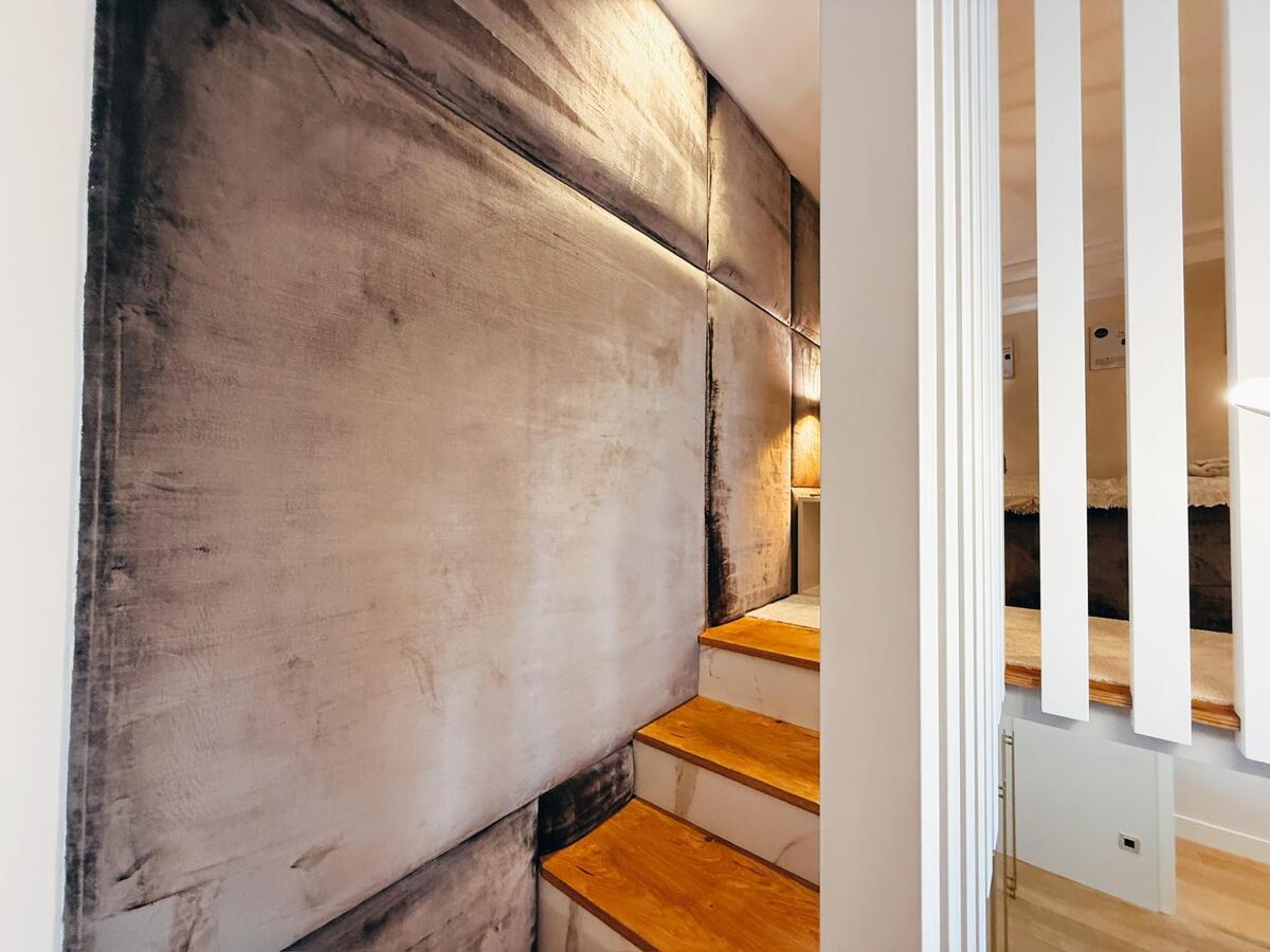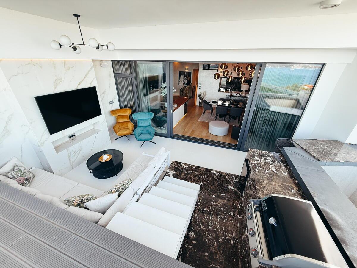 Stanovanje zajema predprostor in dolgi hodnik iz katerega se dostopa do vseh prostorov. V prvem prostoru se je uredila dnevna soba z veliko sedežno garnituro modernimi elementi ter veliko televizijo. Stropovi 4,80 m so omogočili, da se je spalnica uredila v dveh etažah in sicer tako, da so v spodnji omare v zgornji pa intimni prostor za posteljo 180 x 200 cm ter nočni omarici in TV. Manjša splanica, ki je mišljena kot otroška soba ali kabinet ima prav tako dvignjeno posteljo na višjo etaža. Omenjeni kvadrati etaž niso všteti v 133.11 m2, kar ima stanovanje bivalne površine po evidencah Gurs. Hodnik se konča s stopnicami v veliko kuhinjo z jedilnim delom in dnevnim kotičkom. Ta prostor ima drsna, panoramska okna ter izhod na teraso s pogledom na morje. Prav ta terasa je najlepši element stanovanj, saj ima nadstrešek in kot takšna predstavlja podalšek stanovanja ter mu daje pridih indoor outdoor bivanja vse mesece v letu.
