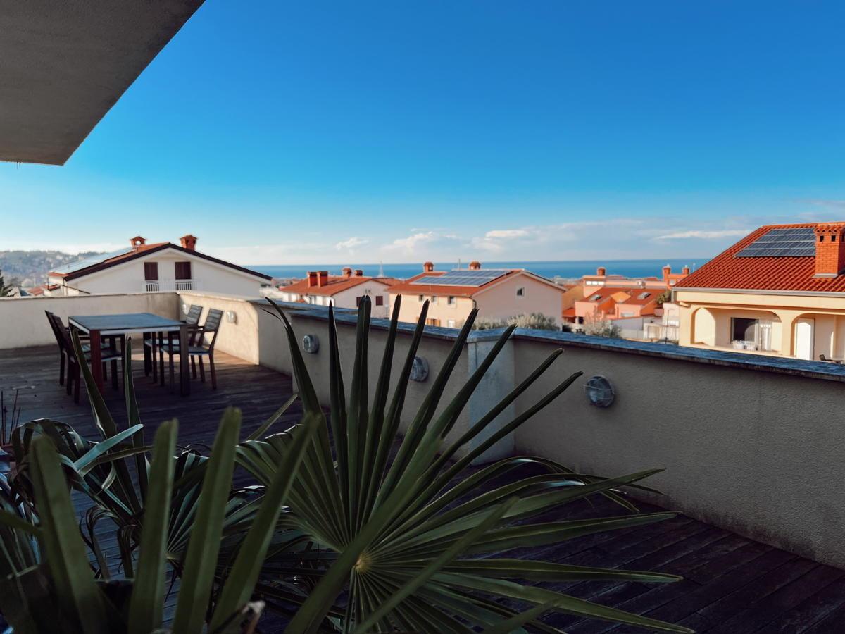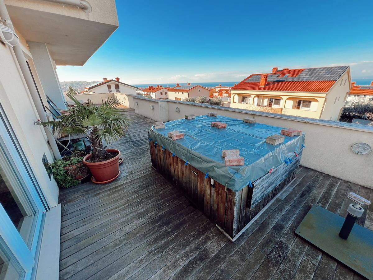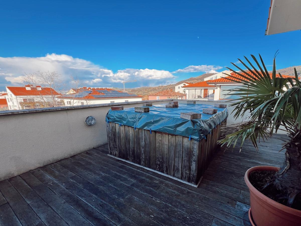 Stanovanje ima veliko teraso s prečudovitim razgledom na morje in okolico. Na terasi je jacuzzi ter dovolj prostora za postavitev velike jedilne mize za druženja. V mansardnem delu je balkon s še lepšim razgledom na morje.