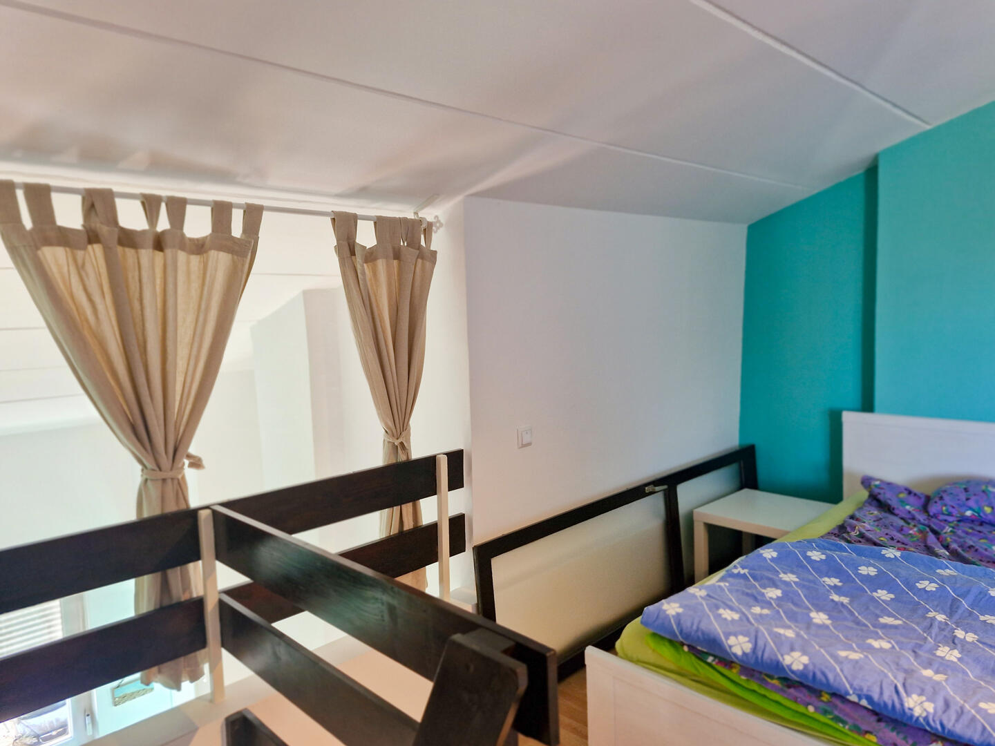 svetlo prostorno spalnico na galeriji z izhodom na zastekljen balkon