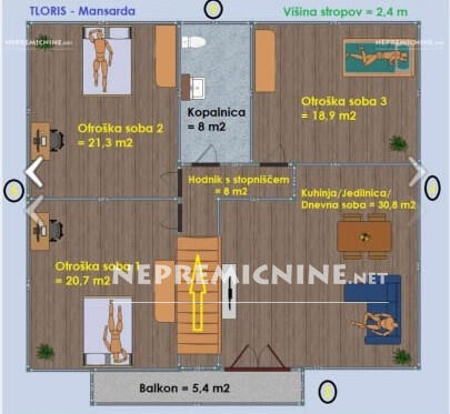 NADSTROPJE: terasa, velik prostor z veliko naravne svetlobe, ki obsegajo dnevno sobo, jedilnico in del, ki je namenjen postavitvi kuhinje, tri prostorne otroske sobe in kopalnico z WC-jem